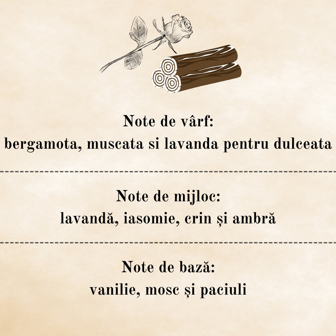 Notele de vârf de bergamotă, mușcată și lavandă oferă deschidere dulce și plăcută, iar inima parfumului, cu accent de lavandă, iasomie, crin și ambră, adaugă sau alură florală sofisticată. La final, notele de bază de vanilie, mosc și paciuli conferă o senzație de căldură și confort, transformând această lumânare într-o adevărată bijuterie olfactivă.