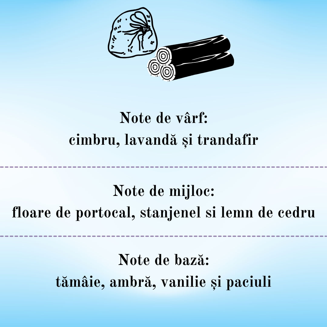 Notele de vârf delicate de cimbru, lavandă și trandafir oferă o deschidere fresh și florală, iar inima parfumului, cu accent de floare de portocal și lemn de cedru, adaugă sau alură subtilă, dar deosebită. Notele de bază captivante de tămâie, ambră, vanilie și paciuli aduc profunzime și o senzație de căldură, creând o atmosferă unică și senzorială.