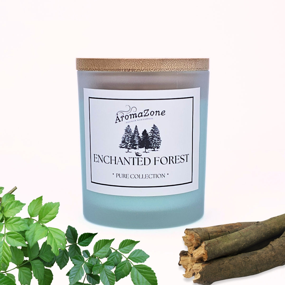 ENCHANTED FOREST este o lumânare parfumată handmade, turnată în recipiente mate de sticlă cu capac din bambus – o lumânare cu parfum mistic, lemnos și reconfortant.