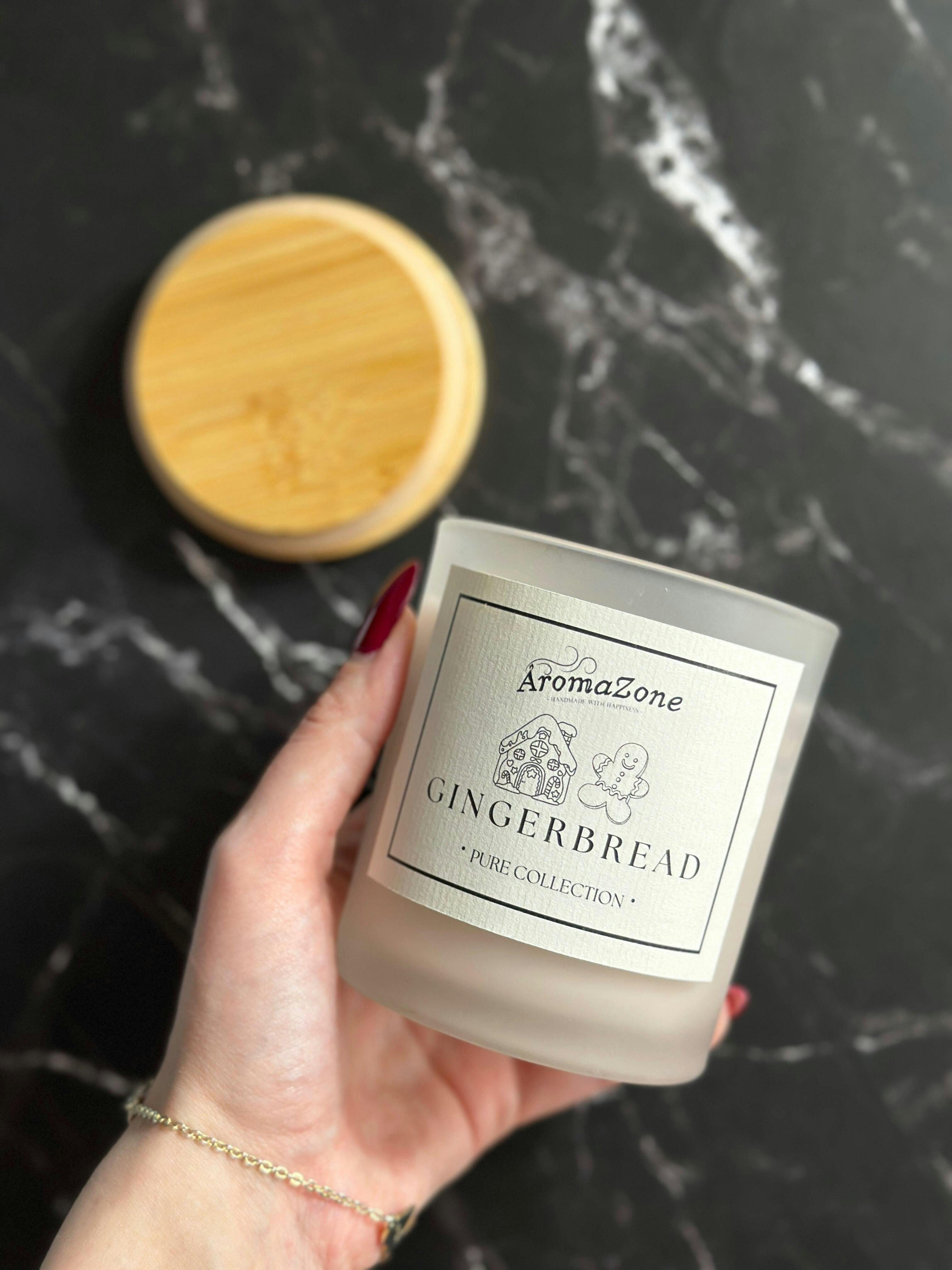 GINGERBREAD este o lumânare parfumată handmade din ceară naturală de cocos și soia, turnată în recipiente mate de sticlă cu capac de bambus – o lumânare decorativă care evocă spiritul sărbătorilor cu arome calde de scorțișoară și turtă dulce.