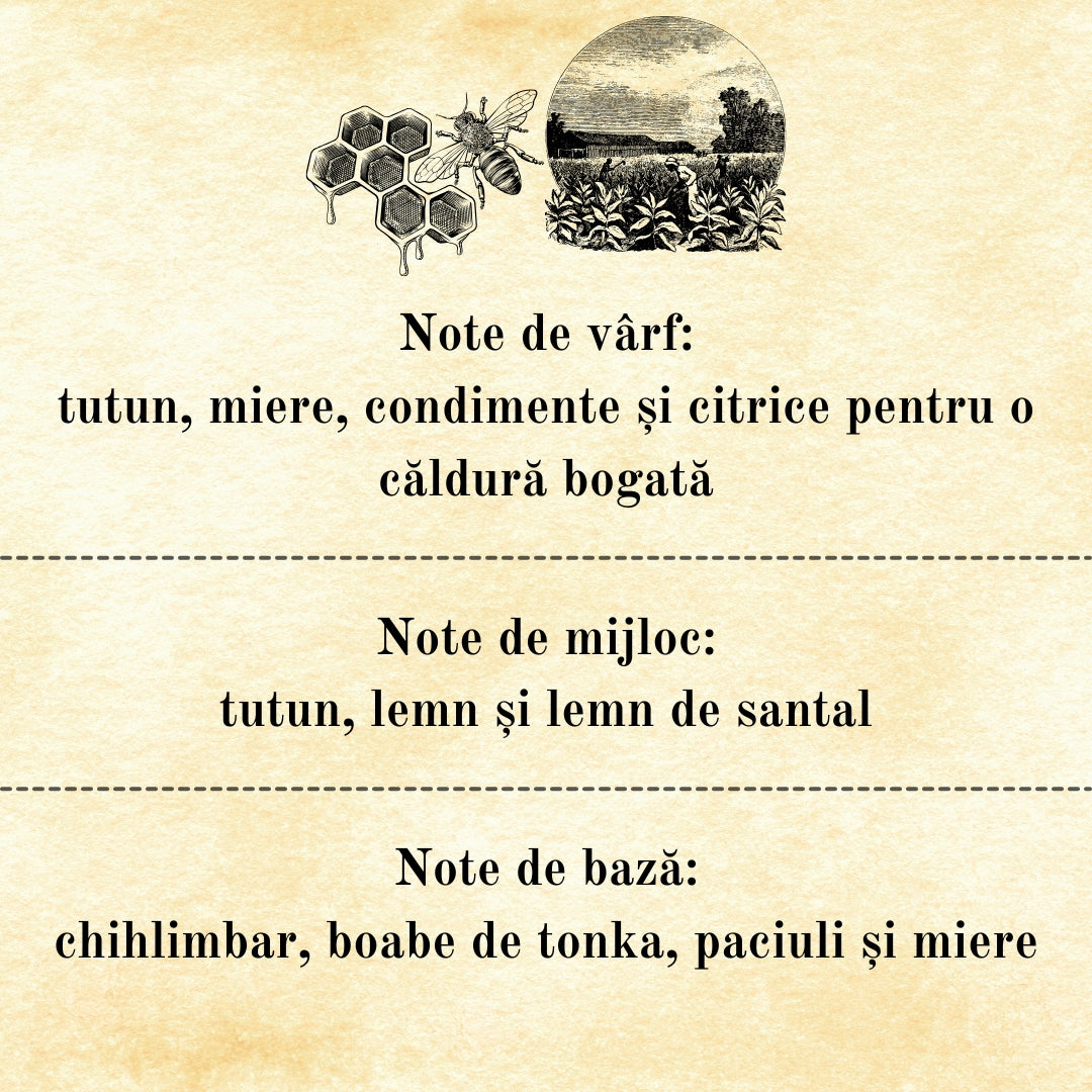 Notele de vârf de tutun, miere, condimente și citrice aduc o deschidere proaspătă și bogată, ce combină dulceața cu o căldură subtilă. Inima parfumului, cu accent de tutun, lemn și lemn de santal, adaugă opulență și profunzime, iar notele de bază de chihlimbar, boabe de tonka, paciuli și miere completează această compunere olfactivă cu un finisaj neted, pământesc și captivant.