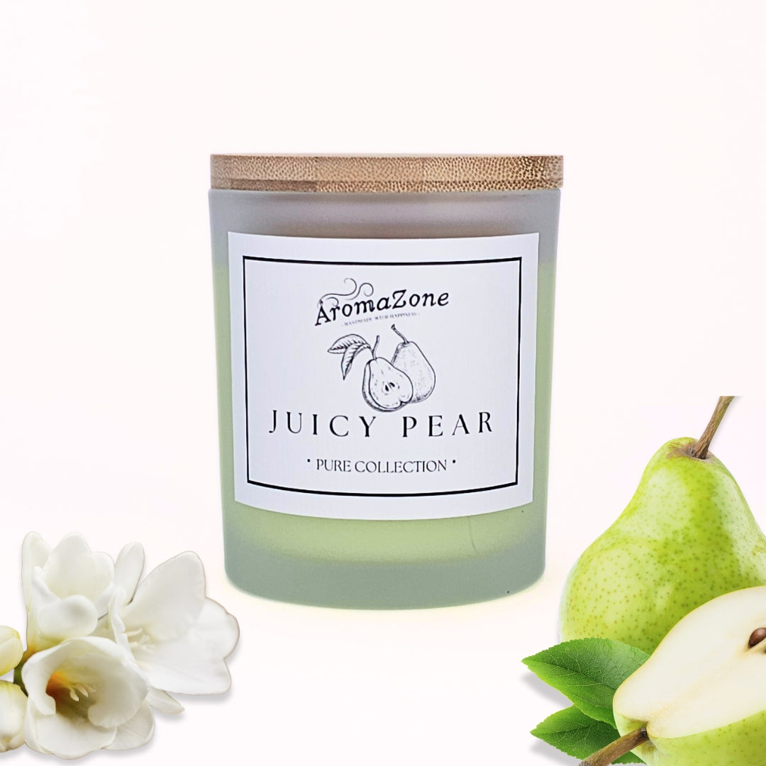 JUICY PEAR este o lumânare parfumată handmade, turnată în recipiente mate de sticlă cu capac din bambus – o lumânare decorativă elegantă, cu parfum floral-fructat și textură olfactivă fresh.