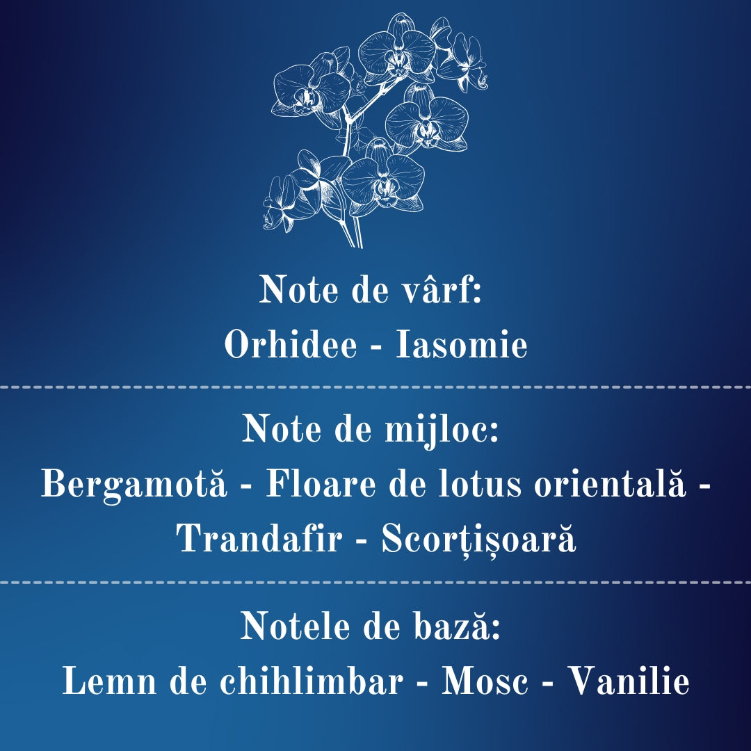 - Note de vârf: Orhidee, Iasomie – Un început floral, elegant și delicat, cu arome de flori exotice ce îți vor încânta simțurile.