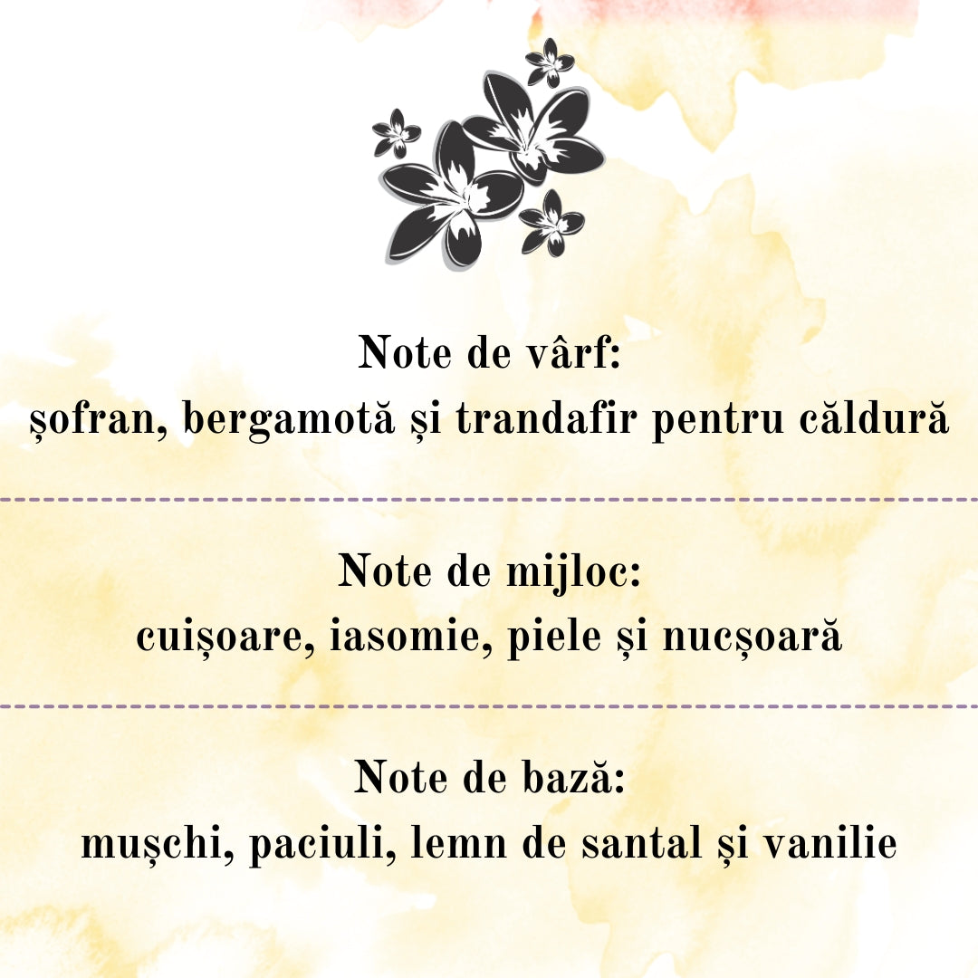 În deschiderea lumânării, note delicate de șofran, bergamotă și trandafir creează o senzație de căldură și rafinament. Notele de inimă, puternice și intrigante, de cuișoare, iasomie, piele și nucșoară adaugă sau adâncire intensă și misterioasă parfumului. În final, note de bază liniștitoare de mușchi, paciuli, lemn de santal și vanilie aduc o senzație de calm și confort, completând această compoziție olfactivă unică.